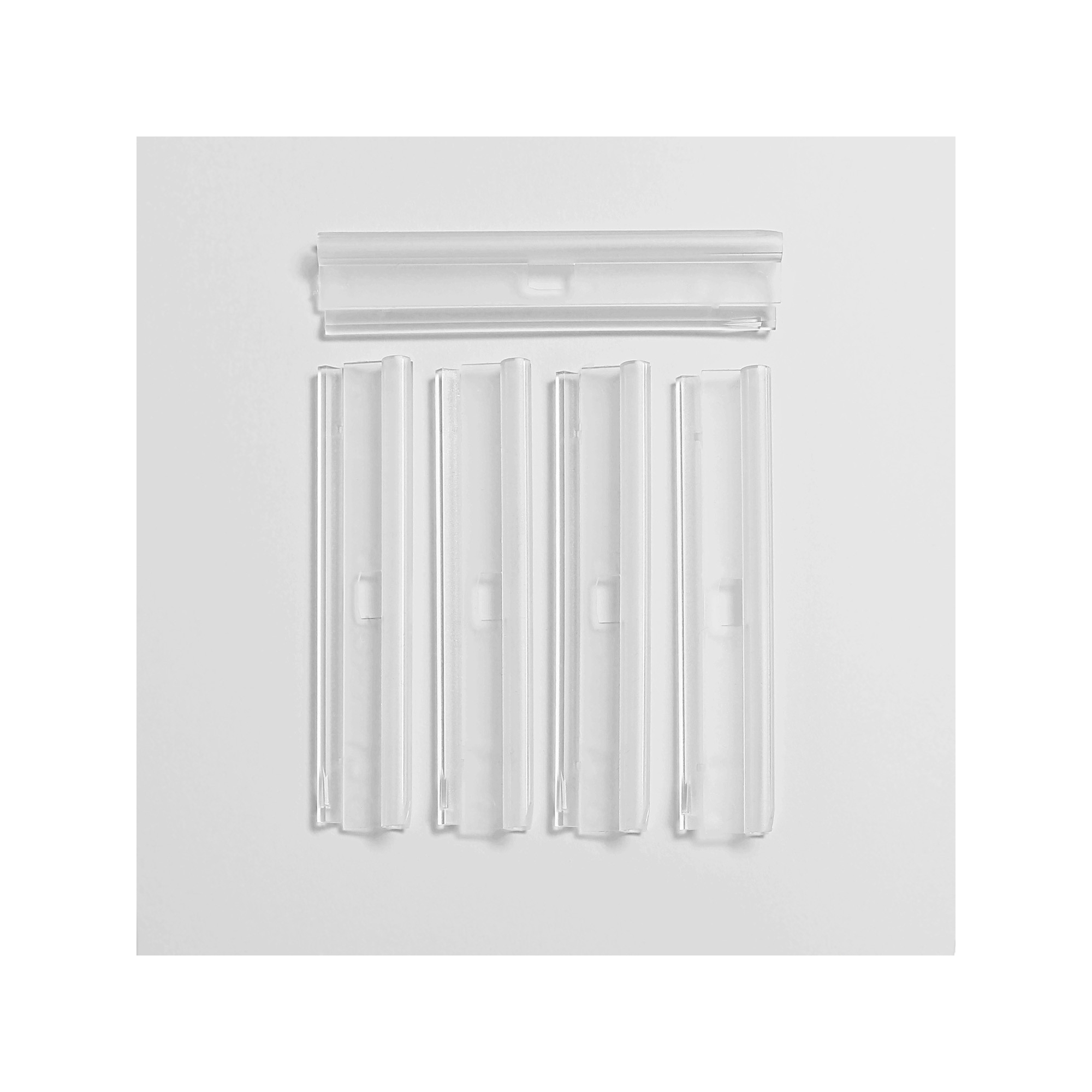 Jeu de 5 barrettes hautes transparentes pour fixer un store à lamelles verticales de 89mm sur les chariots coulissants du rail.
