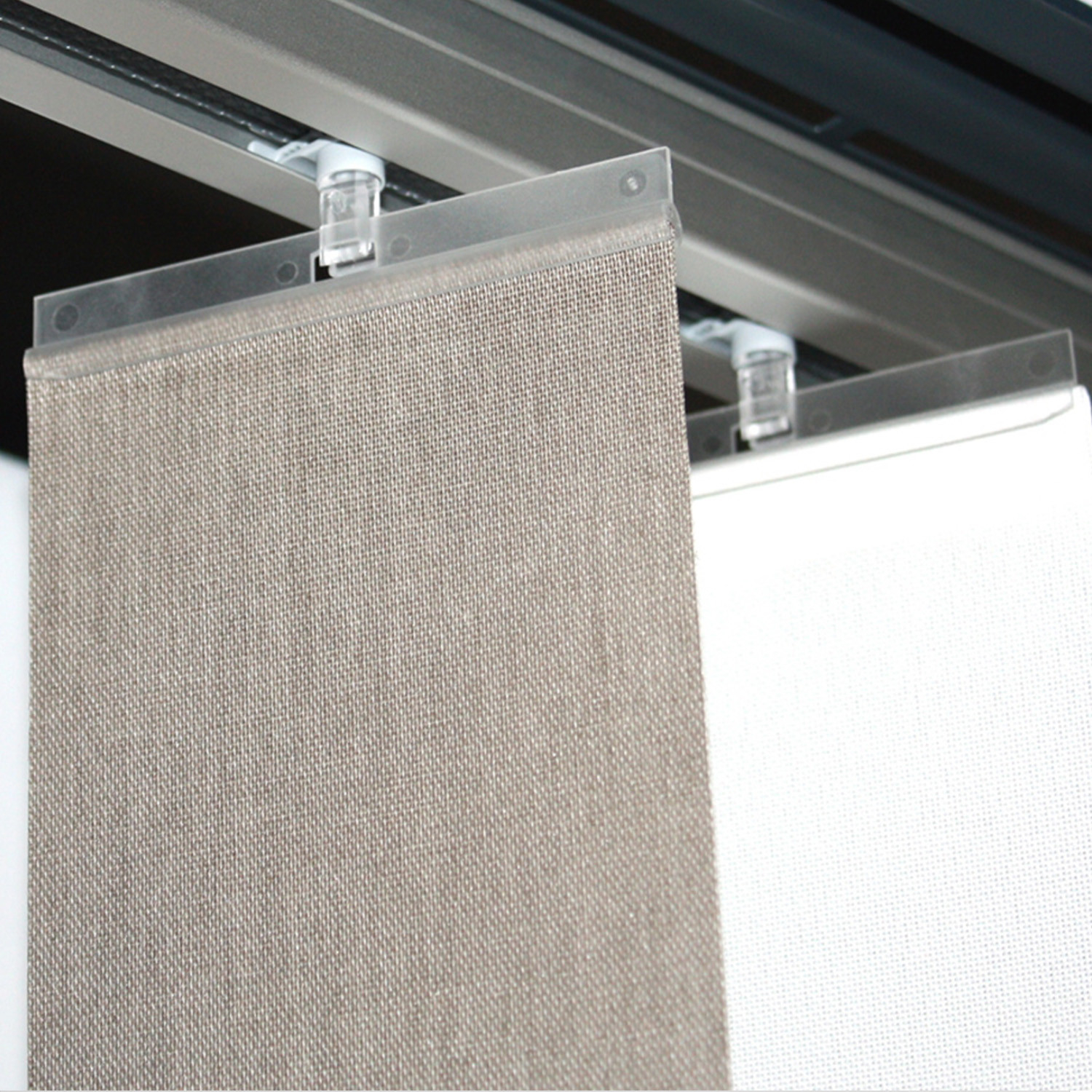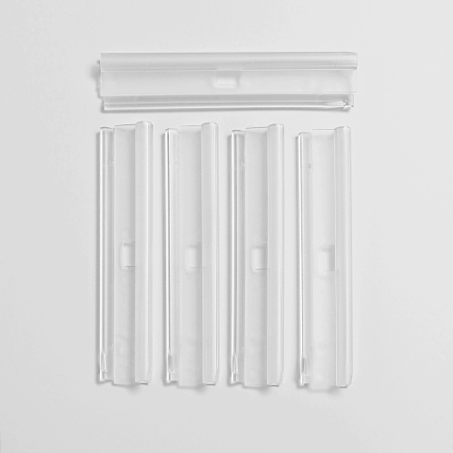 Jeu de 5 barrettes hautes transparentes pour fixer un store à lamelles verticales de 127mm sur les chariots coulissants du rail.