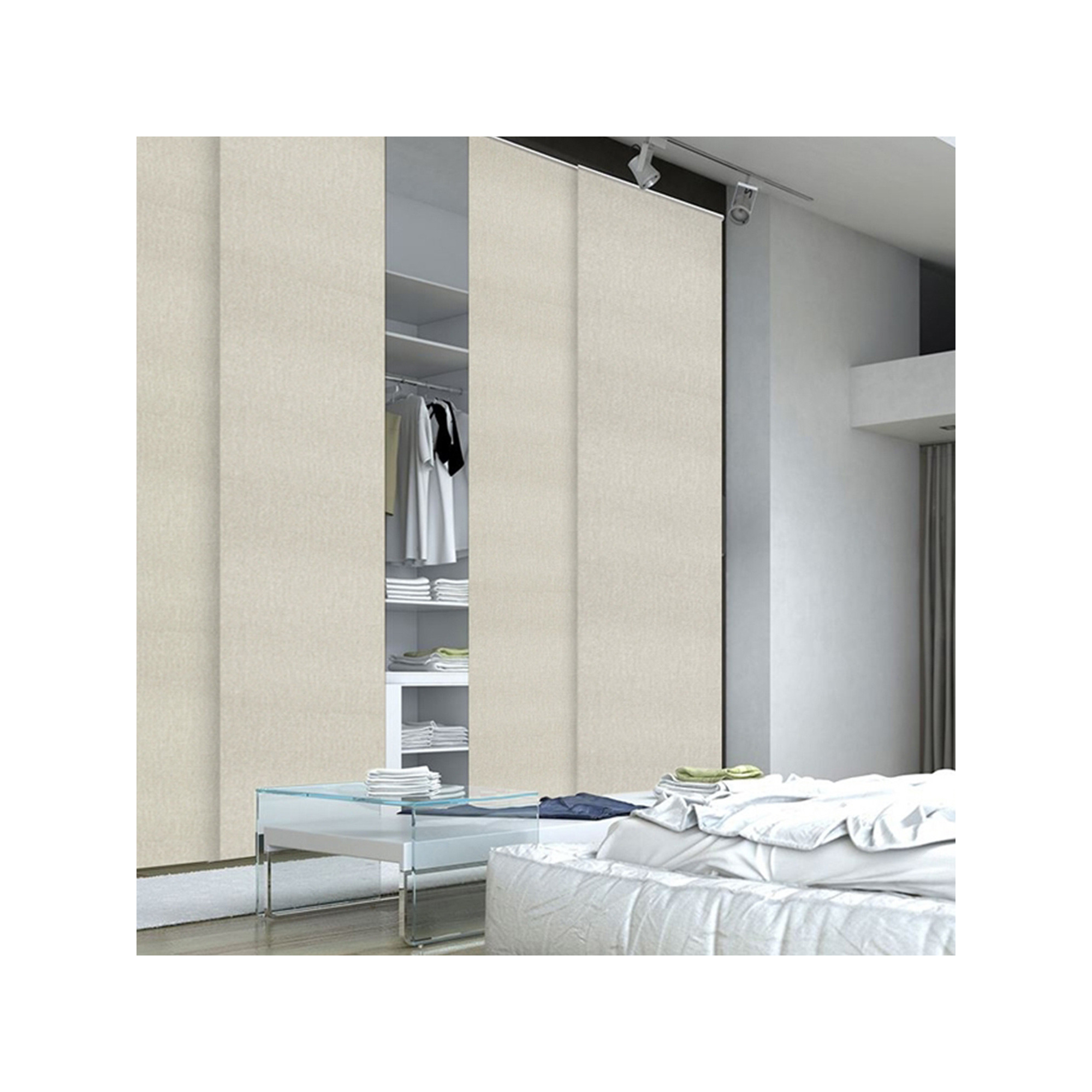 Panneau en tissu avec bande auto agrippante. Solution idéale pour habiller une baie vitrée, séparer un pièce ou cloisonner un placard.