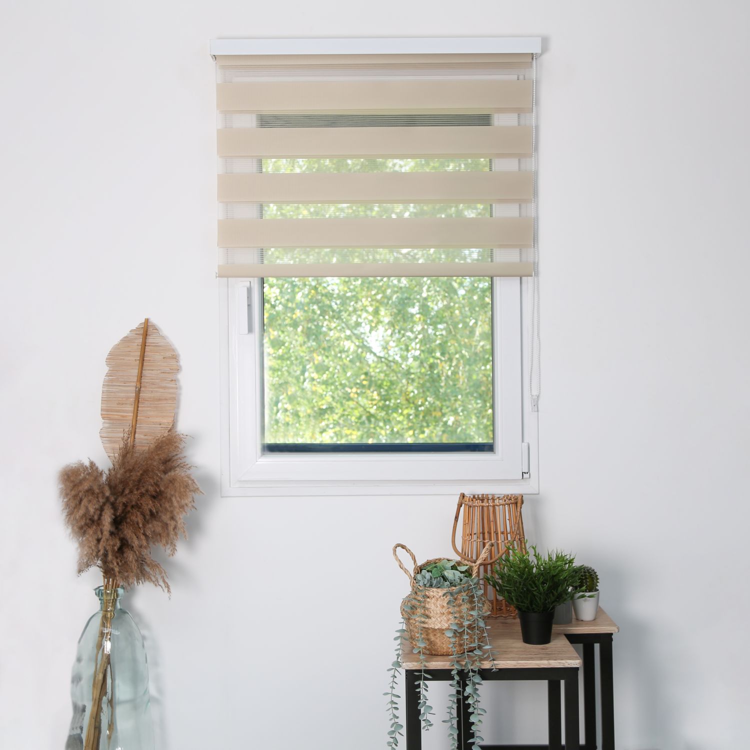 Optez pour ce store jour nuit tamisant jalousie. Son coffrage en alu blanc masque le tube du store pour une finition esthétique. Le tissu du store jour nuit est une alternance de bandes de voilage et de tissu tamisant permettant un subtil dosage de la lumière.
